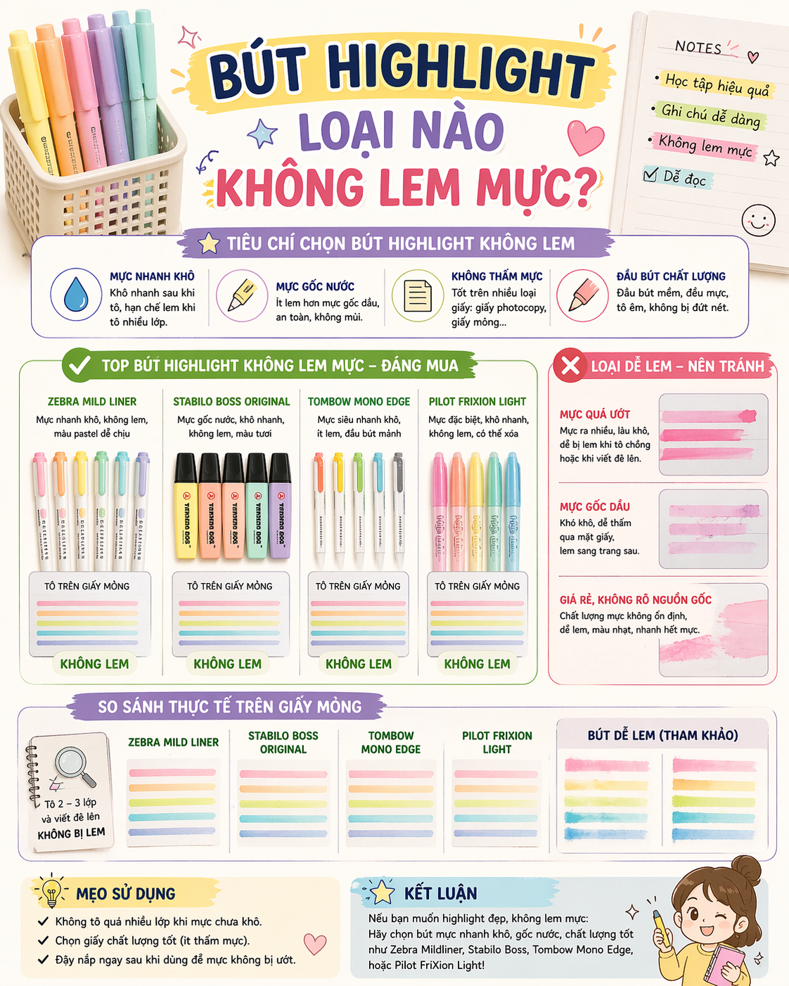 Không có loại bút highlight nào hoàn toàn miễn nhiễm với việc lem mực. Nhưng với lựa chọn và cách dùng phù hợp, bạn có thể giảm vấn đề này xuống mức gần như không đáng kể.