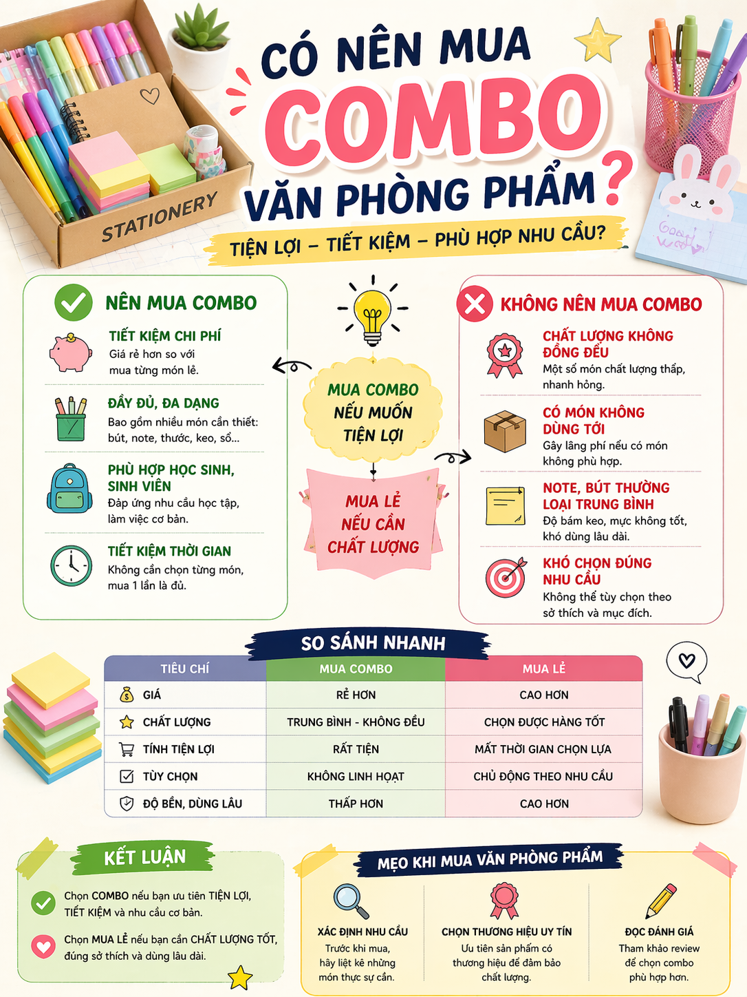 Combo văn phòng phẩm—những bộ sản phẩm đóng gói sẵn gồm bút, sổ, thước, giấy note—ngày càng phổ biến, đặc biệt trên các sàn thương mại điện tử. Nhìn qua, chúng mang lại cảm giác “mua một lần là đủ”, vừa tiện vừa tiết kiệm.